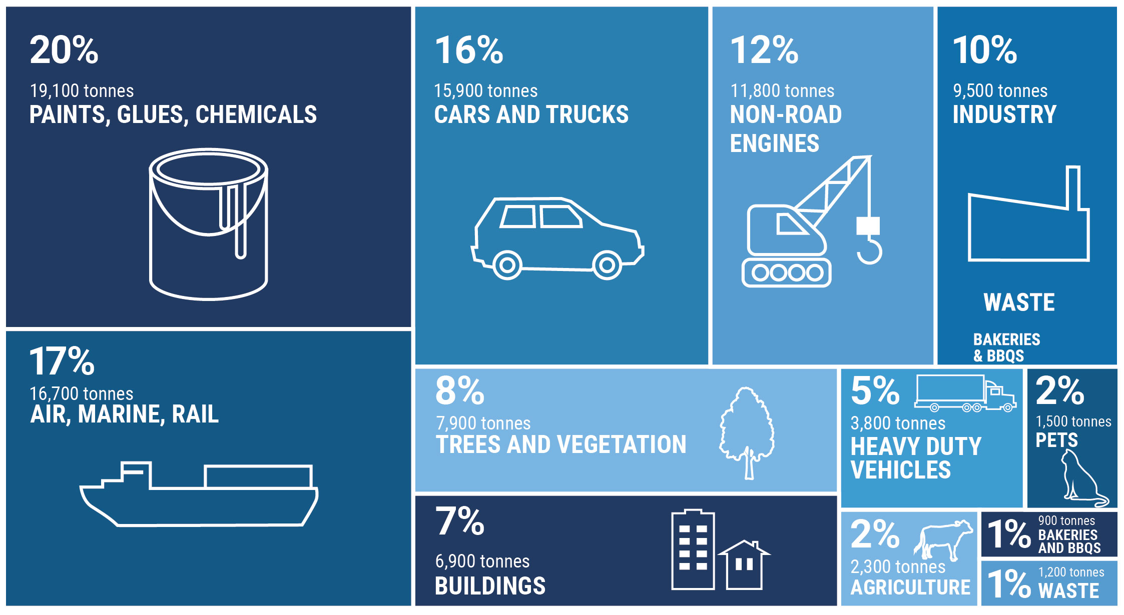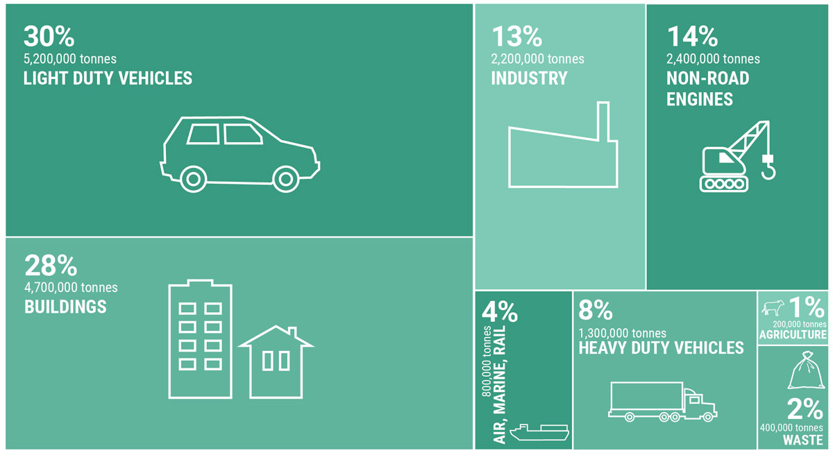 Health-harming air contaminant emissions (total 99,388 tonnes)